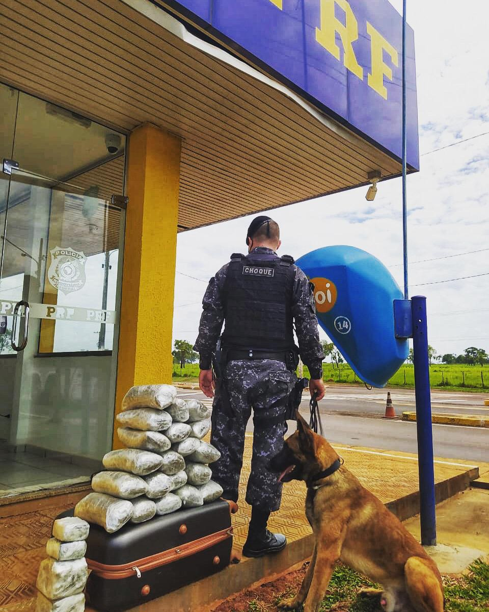 Em abordagem rotineira a equipe da PRF fiscalizava passageiros e bagagens quando suspeitou de uma passageira que apresentou dificuldades em responder perguntas dos policiais. Na dúvida, foi solicitado apoio de uma equipe do canil do Batalhão de Choque para vistoria no compartimento de cargas e bagagens.