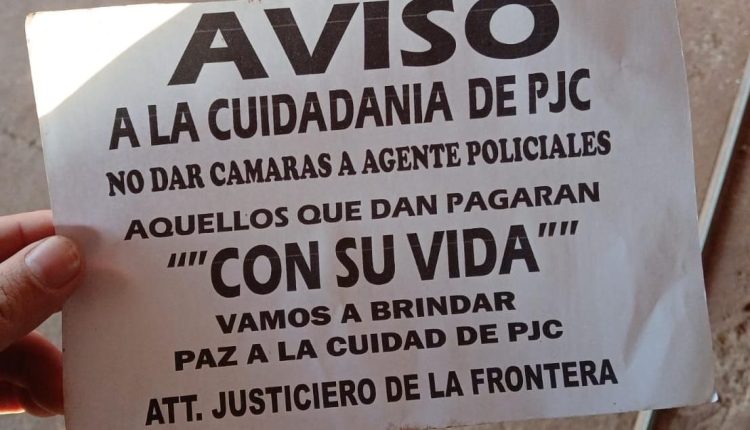 “Aviso à cidadania de PJC: não deem câmeras aos agentes policiais. Aqueles que derem, pagarão com suas vidas. Vamos trazer paz à cidade de PJC. Atenciosamente, Justicieros da Fronteira”, diz o bilhete.
