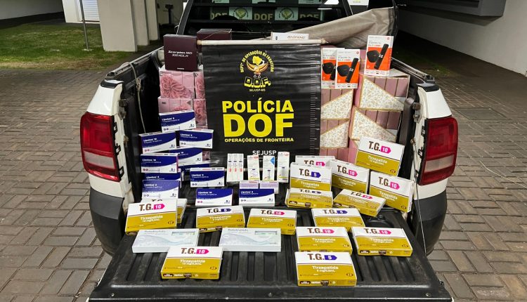 Os militares faziam bloqueio na área rural do munícipio, quando abordaram o condutor. Na Saveiro, foram encontrados conversores de TV, frascos de perfume, canetas de mounjaro e outros medicamentos.
