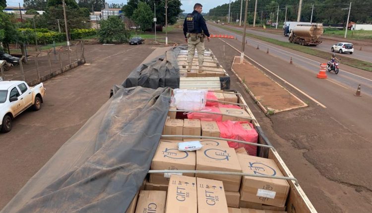 Homens da Polícia Rodoviária Federal (PRF) da Delegacia de Dourados apreenderam nesta terça-feira (18) um carregamento milionário de cigarros produzidos no Paraguai e defensivos agrícolas de introdução proibida no Brasil. A interceptação da carreta aconteceu na BR 163 em frente ao Parque de Exposições João Humberto de Carvalho.