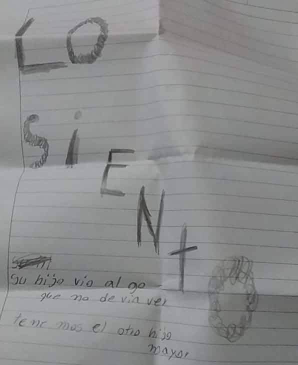 Uma mensagem escrita em uma folha de caderno está escrito em espanhol: “Lo Siento. Su hijo viu algo que no devia vir. Tenemos el otro hijo mayor”.
