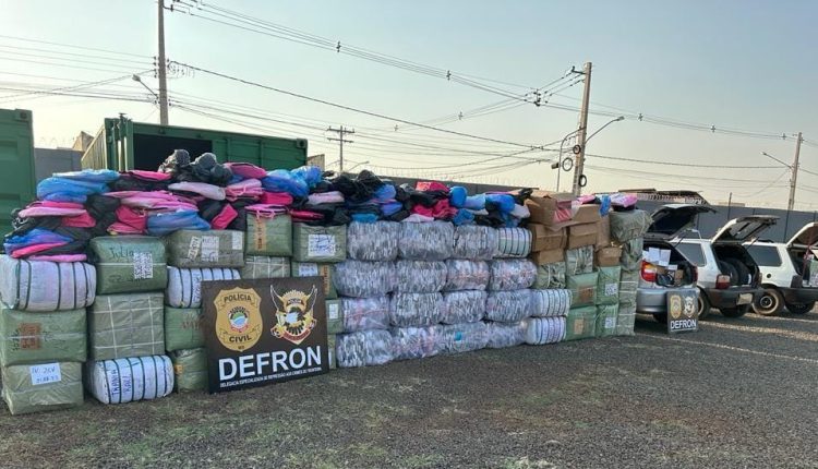 Nos carros os agentes apreenderam vários volumes de patinetes, patins, barracas de camping, luzes de led, malas, fardos de roupas, óculos, lingerie, antenas de wifi, fumos de mascar, aparelhos celulares, pneus, pacotes de cigarros de origem paraguaia, maquiagens e meias.