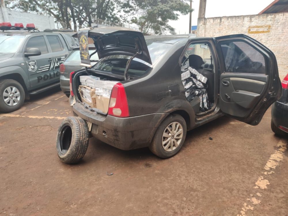 Policiais Militares do Departamento de Operações de Fronteira (DOF) apreenderam, na manhã desta quinta-feira (13), um veículo Renault Logan carregado com 375 pacotes de cigarros de origem estrangeira mais dois pneus, sem a documentação fiscal.