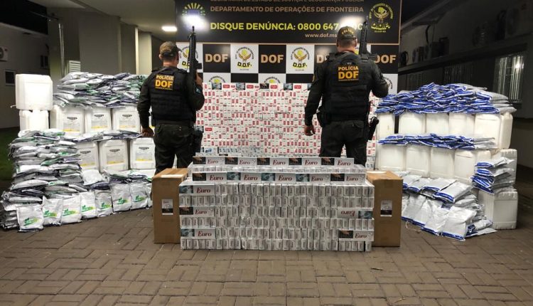 No interior do carro os policiais encontraram 150 quilos de defensivos agrícolas contrabandeados em embalagens em pó, além de 560 litros em galões. O veículo roubado também transportava 745 pacotes de cigarros.