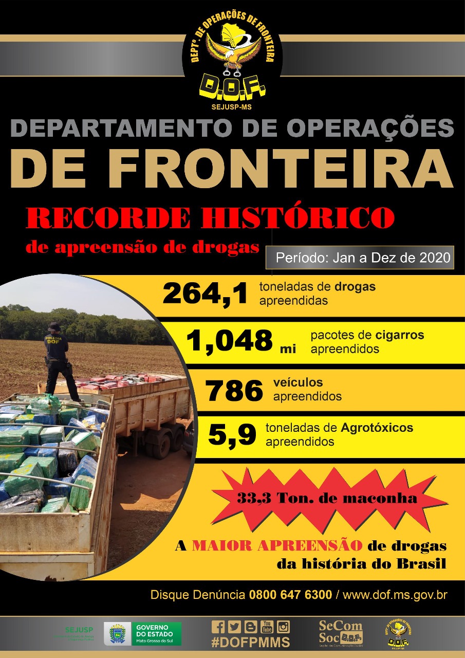 Balanço total divulgado nesta segunda-feira (4), pelo DOF (Departamento de Operações de Fronteira) mostra que em 2020, foram apreendidas 264,1 toneladas de drogas em solo sul-mato-grossense. O número é considerado um recorde para o Departamento, que também realizou no ano passado a maior apreensão de entorpecentes do Brasil.