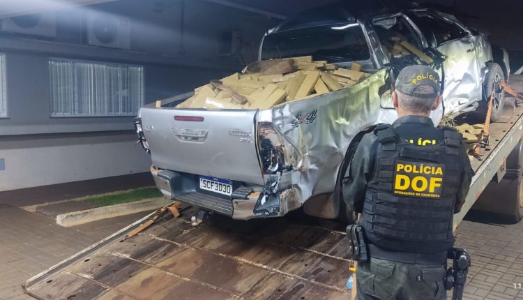 Por alguns quilômetros o homem, de 31 anos, invadiu a pista contrária de direção e colocou em risco a vida dos usuários da via. Em determinado momento, o condutor perdeu o controle da caminhonete, saiu da pista e capotou a Hilux espalhando grande quantidade de volumes prensados da droga.