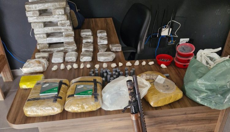 No galpão foram encontrados 16,7 quilos de maconha, 3,1 quilos de skunk, 600 gramas de cocaína, 700 gramas de crack, além de 29 cartuchos calibre 12 carregados, espoletas, balotes e materiais para recarga de munição. O local continha ainda brinquedos associados à atividade anterior do suspeito, reforçando a ligação familiar e a gerência do bunker por sua filha.