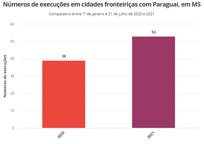 Relatório da Sejusp (Secretaria Estadual de Segurança Pública) divulgado na terça-feira (3), revela que de janeiro a julho de 2021, 87 pessoas foram executadas na fronteira do Brasil com o Paraguai, dessas, 53 ocorreram em Ponta Porã – número bem maior no comparativo com o mesmo período do ano passado, quando foram 39 assassinatos em solo brasileiro.