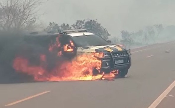 Equipes do Corpo de Bombeiros seguem em reforço para a BR-060 região do Frigorífico JBS onde grande incêndio toma conta das margens da rodovia encoberta por fumaça. O fogo atingiu inclusive uma viatura da Polícia Rodoviária Federal – PRF, de policiais que controlavam o tráfego e começavam interditar a rodovia.
