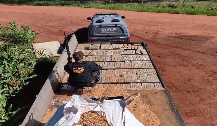 O veículo foi abordado pelos homens do DOF em um bloqueio montado na rodovia estadual e durante a entrevista o condutor apresentou excesso de nervosismo, o que motivou uma busca minuciosa, sendo localizados diversos tabletes de maconha um fundo falso na carroceria e dentro de uma bolsa de adubo.