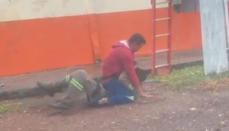 O caso aconteceu em frente a uma conveniência e logo após a briga, os dois homens saíram rindo e abraçados.