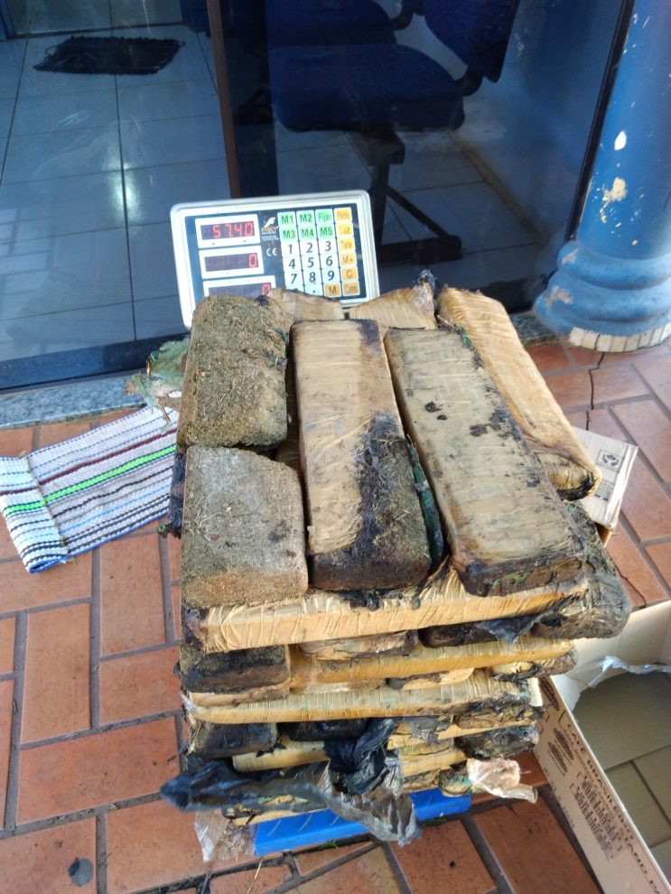 Uma equipe foi acionada para checar a informação logo confirmada com a constatação de vários tabletes do entorpecente. Com as buscas na área os agentes apreenderam 74 tabletes espalhados que pesaram 57,350 quilos.