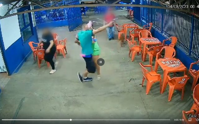 Nas imagens das câmeras de segurança do local é possível ver o momento em que o autor tira a arma da cintura e aponta para o lado de fora do estabelecimento.