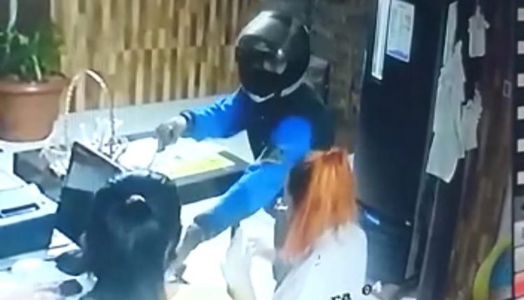 Imagens mostram que aparentemente um outro motociclista do lado de fora dava cobertura para o assaltante, que ao deixar o local deixa cair alguma coisa e pega antes de subir na moto que ficou ligada durante a ação.