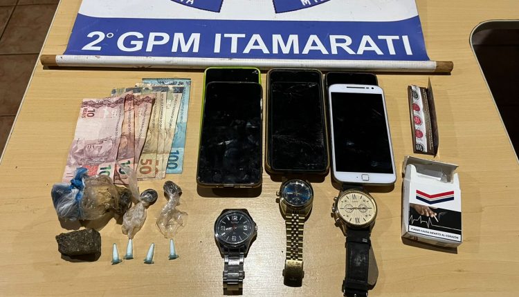 A equipe realizou a abordagem do condutor e do passageiro. Em consulta ao sistema policial, foi constatado que o passageiro utilizava tornozeleira eletrônica e já possuía antecedente por tráfico de drogas. Durante a revista pessoal, os militares encontraram, dentro de uma pochete, duas porções de maconha, uma porção de substância conhecida como “Dry Ice Marroquino”, R$ 280 em dinheiro trocado e dois aparelhos celulares.