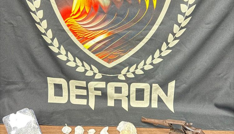 Durante as buscas na residência, foram encontradas 11 porções de cocaína, totalizando 52 gramas, escondidas em um sofá e acondicionadas em uma luva infantil, além de sete gramas de crack, localizadas em uma meia infantil. No mesmo terreno, foi apreendida uma arma de fogo do tipo revólver calibre .32, que, segundo testemunhas, havia sido ocultada pelo suspeito antes de fugir do local.