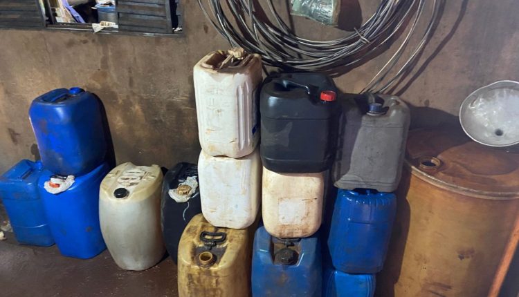 Durante a diligência, os policiais identificaram, já na parte externa do local, diversos galões plásticos vazios, comumente utilizados para o transporte de combustíveis. Em razão das fundadas razões, foi realizada vistoria em um cômodo nos fundos do imóvel, onde foram encontrados mais recipientes com gasolina, etanol e óleo diesel, todos armazenados sem qualquer tipo de controle técnico ou autorização legal.