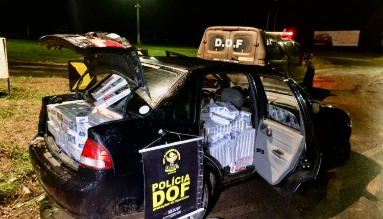 Segundo o registro policial, os agentes faziam bloqueio na região conhecido como ‘Copo Sujo’, quando deram ordem de parada ao condutor de um GM/Classic. No interior do carro foram localizados 500 pacotes de cigarros.