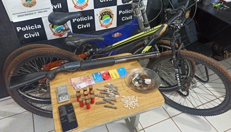 Segundo o boletim de ocorrência, no imóvel, os policiais apreenderam uma espingarda calibre 12, dez munições, duas bicicletas furtadas e cerca de 30 porções de pasta base de cocaína, além de uma porção grande.