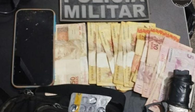 Na pochete do suspeito, os policiais encontraram R$ 336,50 em dinheiro, oito papelotes de droga, uma corrente semelhante a prata e o simulacro de arma de fogo envolto em fita preta e prata.