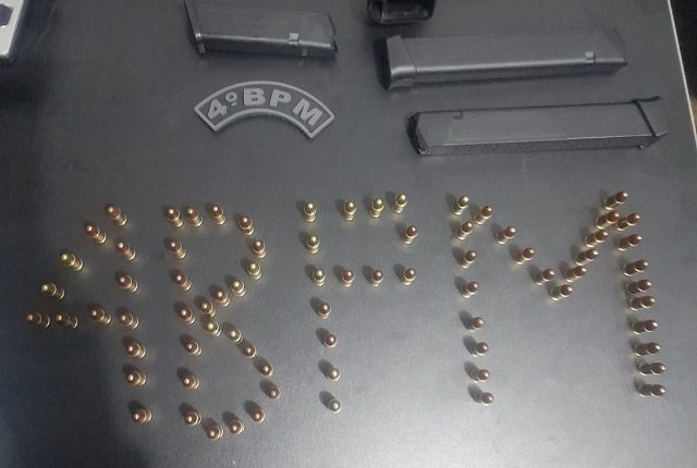 No lado esquerdo da sua cintura, os agentes encontraram dois carregadores estendidos com capacidades para 30 tiros, contendo 60 munições (30 cada), munições de diferentes marcas, sendo: 15 munições da marca 5&B 9X19 e 62 munições da marca Luger.