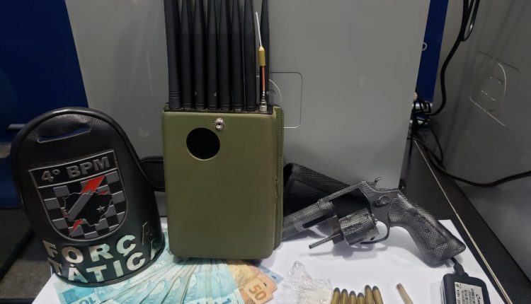 O terceiro rapaz estava na função de motorista do carro e, durante vistoria ao veículo, os policiais localizaram o bloqueador de sinal de celular e redes móveis, o qual estava escondido dentro do forro no banco do motorista.