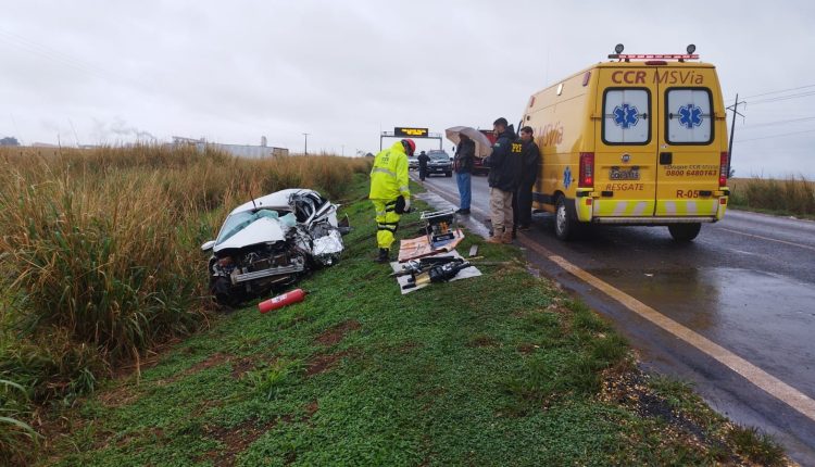 Com o impacto, o utilitário ficou com a frente praticamente toda destruída, enquanto a carreta parou metros à frente do ponto da colisão.
