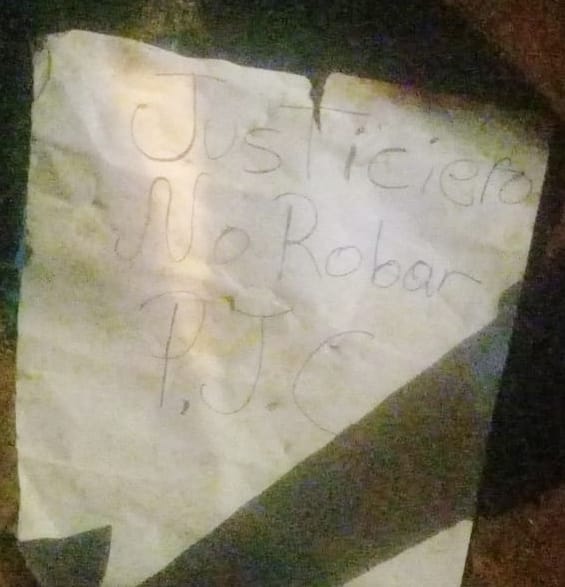 Os peritos da Polícia Nacional encontraram no lugar do ataque 47 cascas de cápsulas de pistola 9 milímetros. Uma cartolina branca foi deixada próxima a uma das vítimas onde estava escrito “Justiciero no robar P.J.C”.