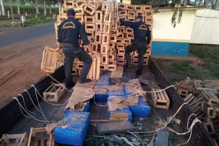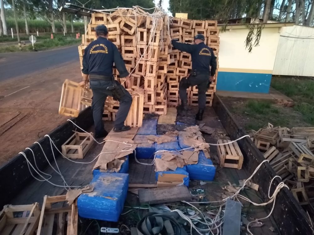 Os policiais realizavam policiamento ostensivo na rodovia quando avistaram um caminhão com placas de Eunápolis (BA) e um VW Gol com placas de Uberaba (MG) parados próximo a entrada de um assentamento. Três homens estavam arrumando a carga de caixas de madeira no caminhão. Eles foram abordados e em buscas na carroceria foram encontrados os tabletes de maconha.