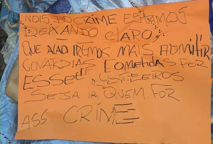 Junto ao corpo foi encontrado um cartaz onde estava escrito “nós do crime estamos claro que não iremos mais admitir covardias cometidas por estes justiceiros seja lá que for. Ass: Crime”.