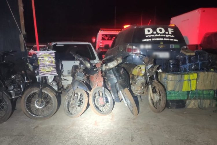 Policiais Militares do Departamento de Operações de Fronteira (DOF) apreenderam, na madrugada deste domingo (29), sete motocicletas de origem estrangeira, sem placas de identificação carregadas com 20 fardos de maconha, com peso total 709 quilos. A ação ocorreu durante um bloqueio policial na rodovia MS-485, região de Amambai.