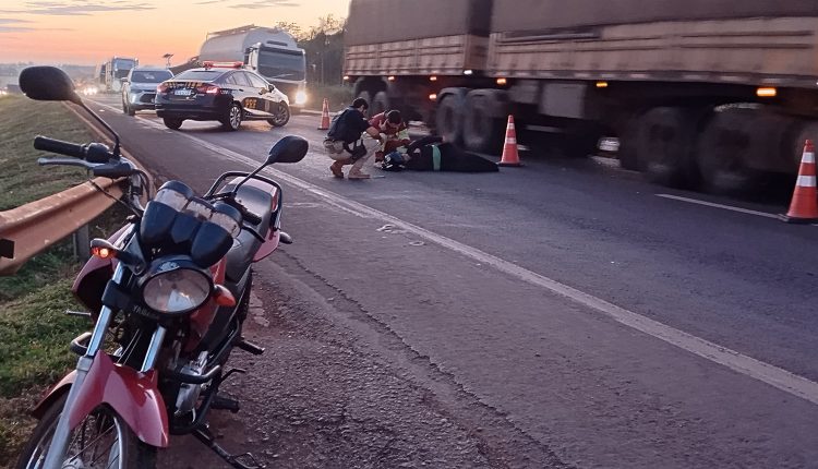 Mulher de 45 anos, que pilotava motocicleta Yamaha foi atropelada por uma carreta no fim da madrugada desta sexta-feira (10/5), na BR-163, na saída de Dourados para Caarapó, a 200 metros da rotatória que dá acesso à Embrapa e Sitioca Campo Belo.