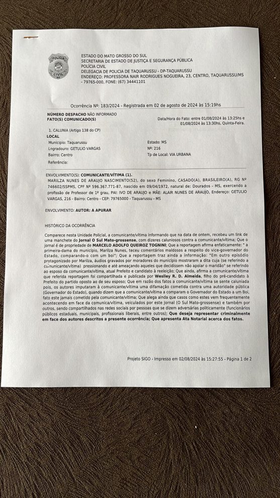 Na denúncia, Marilza Nunes de Araújo Nascimento narra que estão espalhando nas redes sociais o link de uma manchete do Jornal O Sul Mato-grossense, com conteúdo mentiroso, que configura fake news, além de disseminar calúnia, injúria e difamação