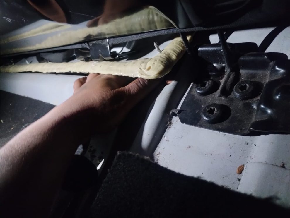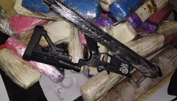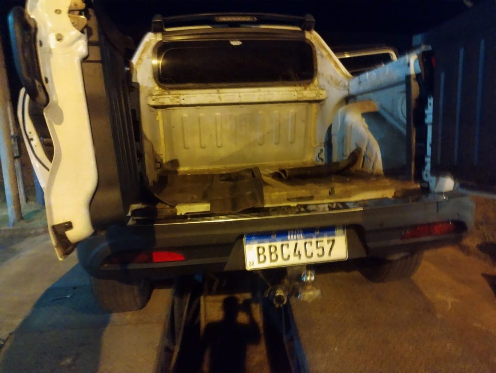 O scanner veicular usado para identificar cargas ilegais em compartimentos ocultos de veículos apontou a existência de fundo falso na carroceria da picape. Quando abriram o compartimento, os policiais acharam e 59 tabletes de maconha, que pesaram 36 quilos e 700 gramas da droga, o fuzil com dois carregadores enrolados em plástico-filme.