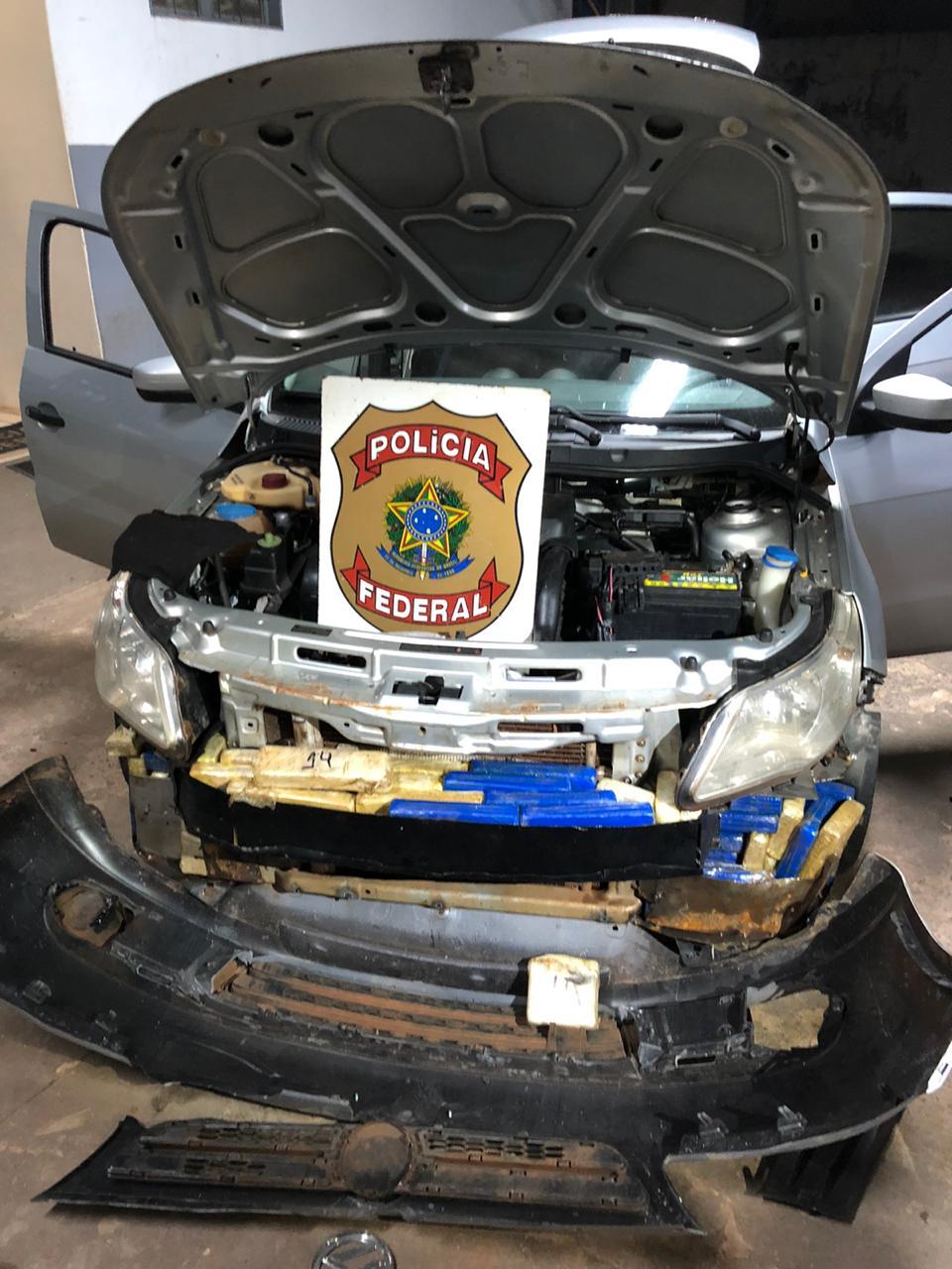 No local os federais encontraram um Gol, que estava carregado de cloridrato de cocaína. A droga estava escondida no para-choque dianteiro. Na oficina também tinha um Fiat Strada, que faria o papel de batedor.
