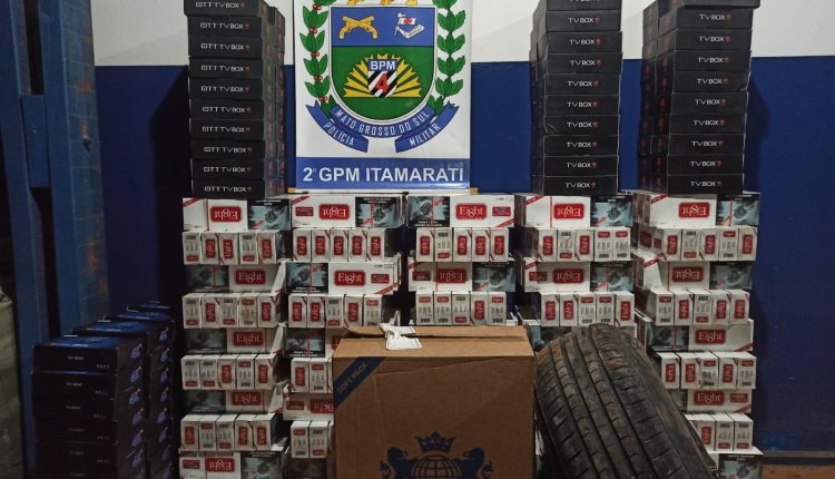 O condutor foi abordado e disse aos militares que o automóvel havia apresentado falha mecânica. Durante vistoria, os agentes encontraram cinco pneus, cinco caixas de óculos, 100 aparelhos de TV Box e 300 pacotes de cigarros.