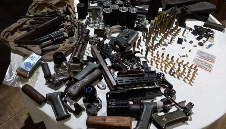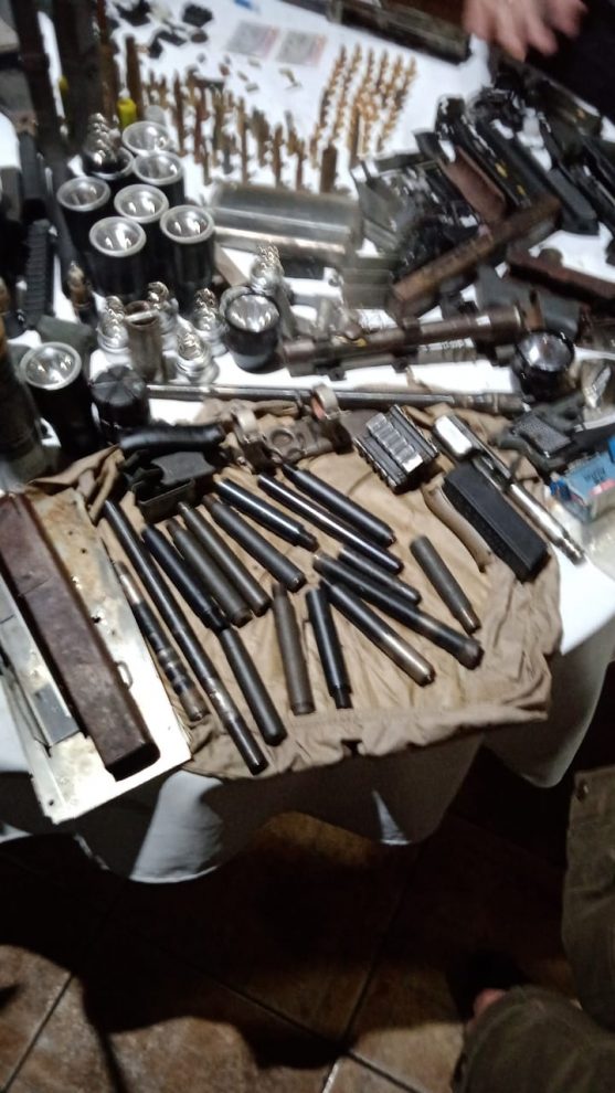 Um trabalho de investigação da Polícia Nacional de Pedro Juan Caballero levou os agentes no começo da noite de ontem (9) a uma residência na Acosta Ñu esquina 4 de Mayo, no bairro Guarani, onde foi encontrado um verdadeiro arsenal de armas, munições e aparatos bélicos. Foram apreendidos 35 cartuchos calibre 7,65, da marca Eagle, 2 cartuchos de calibre .50 da marca C-B.C. 77, 7 cartuchos calibre 5,56, 3 cartuchos calibre 97-61, 6 cartuchos Luger calibre 9 milímetros, 1 cartucho calibre 51 FN, 1 cartucho calibre 57 FN, 1 cartucho calibre 7,62×39, cartucho LC 93, 4 cartuchos calibre 20 com a inscrição JG, 3 cartuchos calibre 7,65 Eagle, 2 cartuchos calibre 12 usados, 1 cartucho de calibre 12, 2 cartuchos calibre 12 com inscrição T, 2 cartuchos de calibre 7,62 usados.