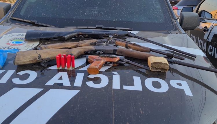 Foram apreendidas duas espingardas calibre 22, uma espingarda calibre 32, uma pistola calibre 22, além de sete munições de calibre 32, 22 munições de calibre 22 e 30 gramas de maconha.