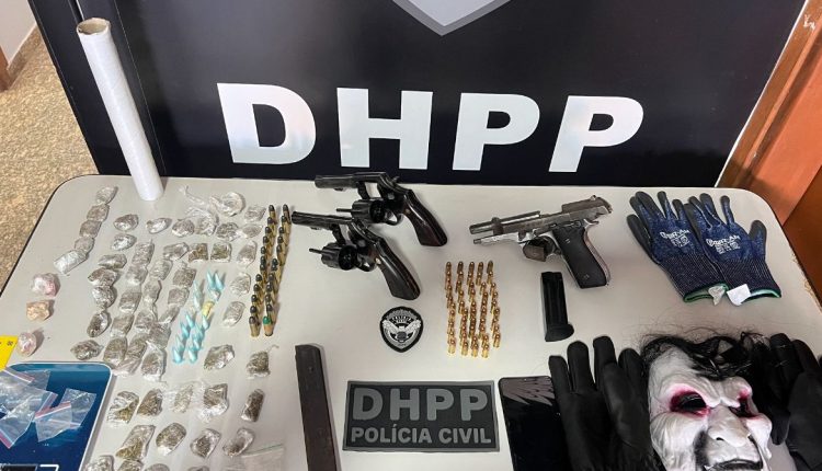 Dois revólveres calibre 38, uma pistola calibre nove mílimetros, um carregador para submetralhadora e munições diversas foram apreendidas, bem como máscaras e luvas, o que corrobora as investigações sobre a prática de roubos.