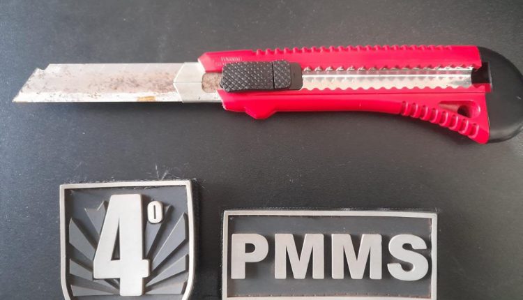 Durante a revista, um estilete vermelho foi encontrado com ele, e constataram-se antecedentes por violência doméstica. Ao ser informado sobre a necessidade de prestar esclarecimentos na delegacia, o autor se recusou e, de forma agressiva, resistiu à prisão, o que demandou o uso de técnicas de imobilização e algemas para contê-lo.
