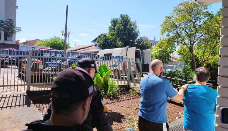 Viaturas do Dracco e da Agepen (Agência Estadual de Administração do Sistema Penitenciário) estão na delegacia, para transferir Iran e Robson a Campo Grande.