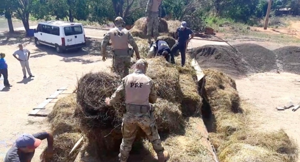 Um cão farejador foi acionado e indicou a presença de droga na carreta. Após retirarem os fardos de feno, os policiais encontraram a maconha. Os veículos e a maconha foram encaminhados para a Polícia Civil.