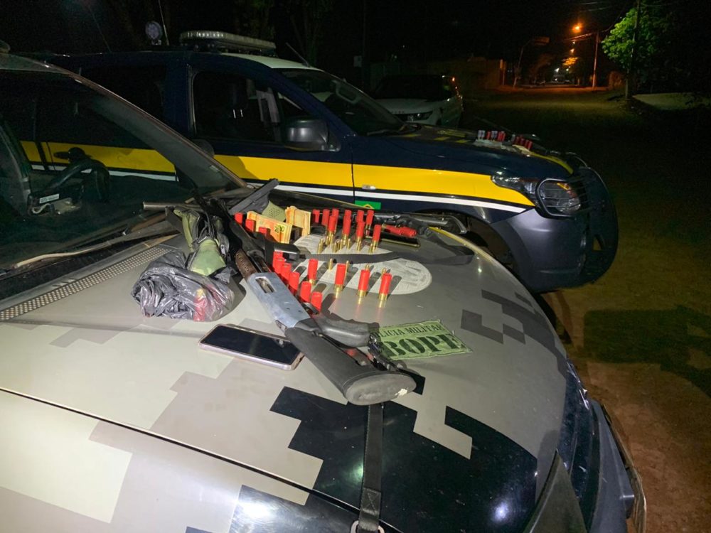 A Polícia Rodoviária Federal (PRF) e o Batalhão de Operações Especiais da Polícia Militar (BOPE) prenderam, em Jaraguari, 2 pessoas e apreenderam quatro armas de fogo, sendo elas, três espingardas calibre 12, e uma pistola Glock calibre 9 milímetros , e 57 munições para calibre 12 e 30 munições calibre 9 milímetros além de um simulacro de carabina, nesta segunda-feira (28).