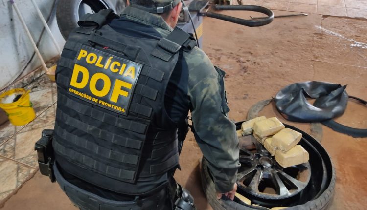 Os militares perceberam algo diferente nos pneus do veículo e com o auxílio de um borracheiro, 54 volumes prensados da droga foram localizados escondidos dentro das rodas, totalizando 30 quilos.