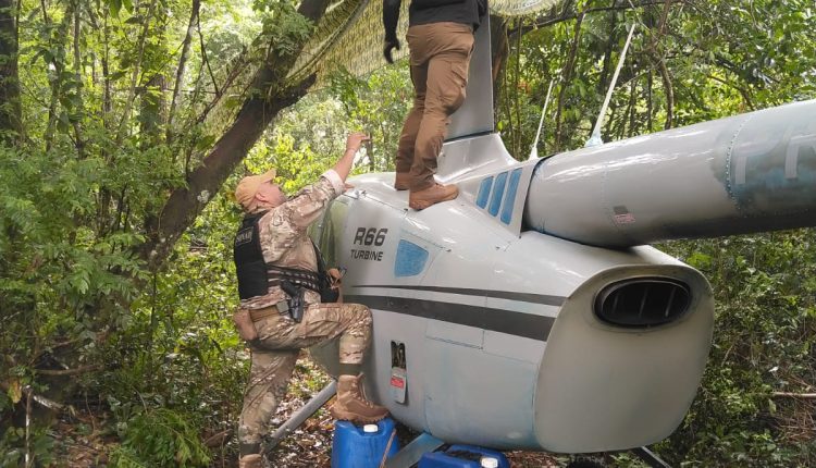 A aeronave estava dentro da mata escondida sob tendas e galhos. Várias armas de fogo, roupas camufladas e equipamentos de comunicação também foram apreendidos.