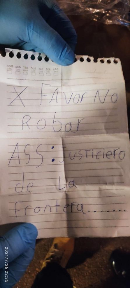 O caso aconteceu nas proximidades da Laguna de Punta Porã e os atiradores deixaram um bilhete onde estava escrito “ x favor no robar. Ass: justiceiro de la frontera”.