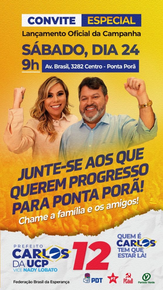“Tenho a honra de convidá-lo (a) para o lançamento oficial da minha campanha para Prefeito de Ponta Porã. Este evento marcará o início de uma nova jornada, onde reafirmaremos nosso compromisso com o desenvolvimento e o progresso de nossa cidade”, reforça o candidato a prefeito de Ponta Porã, Carlos da UCP.