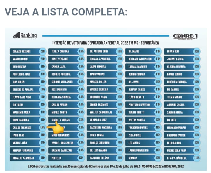 O instituto ouviu 3 mil pessoas em 30 municípios do Estado entre os dias 19 e 23 de julho, e a pesquisa está registrada com os números MS-04968/2022 e BR-02704/2022, e Carlos Bernardo já chega a atingir quase 1 por cento da intenção de votos dos entrevistados.