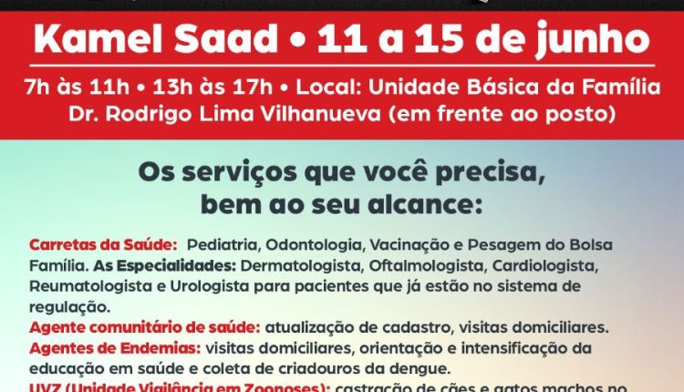A ação “Prefeitura Mais Perto de Você – Cuidando de Todos” chega ao Bairro Kamel Saad durante toda esta semana. De 11 a 15 de junho, as ações estarão concentradas em frente à Unidade Básica da Família Dr. Rodrigo Lima Vilhanueva, das 7h às 11h e das 13h às 17h.