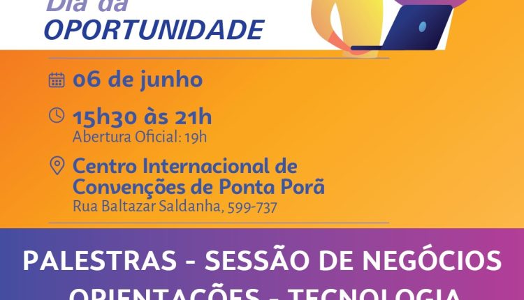 Como uma iniciativa do programa Cidade Empreendedora, executado pelo Sebrae/MS, em parceria com a prefeitura de Ponta Porã, o Dia da Oportunidade será realizado no próximo dia 6 de junho. Com ampla programação composta por sessão de negócios, feira com empreendedores locais e capacitações gratuitas nas áreas de gestão, marketing vendas e atendimento, o evento será das 15h30 às 21h, no Centro Internacional de Convenções de Ponta Porã.